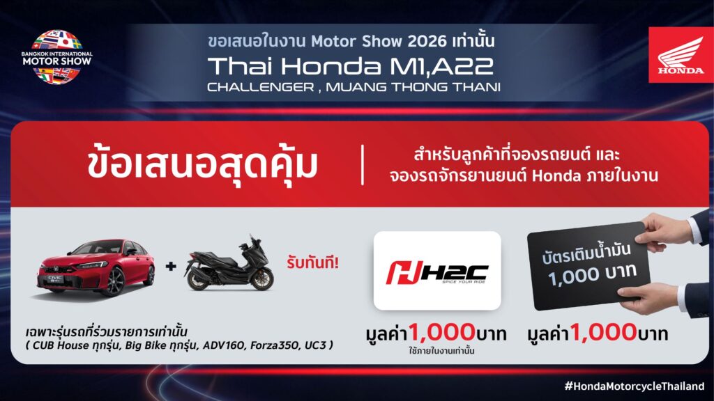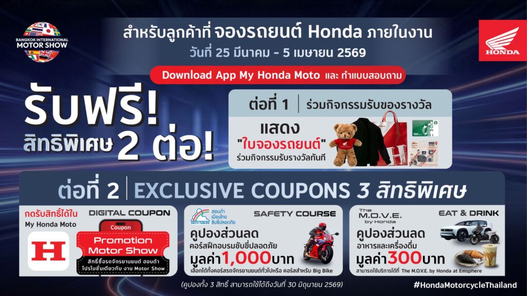 ใครที่ไปเดินงาน Motor Show 2026 อย่าลืมแวะไปที่บูธฮอนด้า เพื่อสัมผัสรถจักรยานยนต์รุ่นใหม่และรับข้อเสนอสุดพิเศษนี้ครับ นอกจากรถสวยๆ แล้ว กิจกรรมในบูธปีนี้จัดเต็มเรื่องประสบการณ์การเดินทางแบบครบวงจรจริงๆ