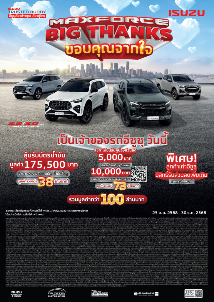 แคมเพจ์นขอบคุณลูกค้าสุดยิ่งใหญ่ “MAXFORCE BIG THANKS ขอบคุณจากใจ” มอบสิทธิ์ลุ้นรับบัตรน้ำมัน PT สำหรับลูกค้าที่ซื้อและรับรถปิกอัพอีซูซุ ดีแมคซ์ ทุกรุ่น หรือรถยนต์นั่งอเนกประสงค์มิว-เอ็กซ์ ทุกรุ่น ตั้งแต่วันที่ 25 ตุลาคม – 30 ธันวาคม 2568 จับรางวัลจำนวน 9 สัปดาห์ โดยมีรายละเอียดรางวัล ดังนี้